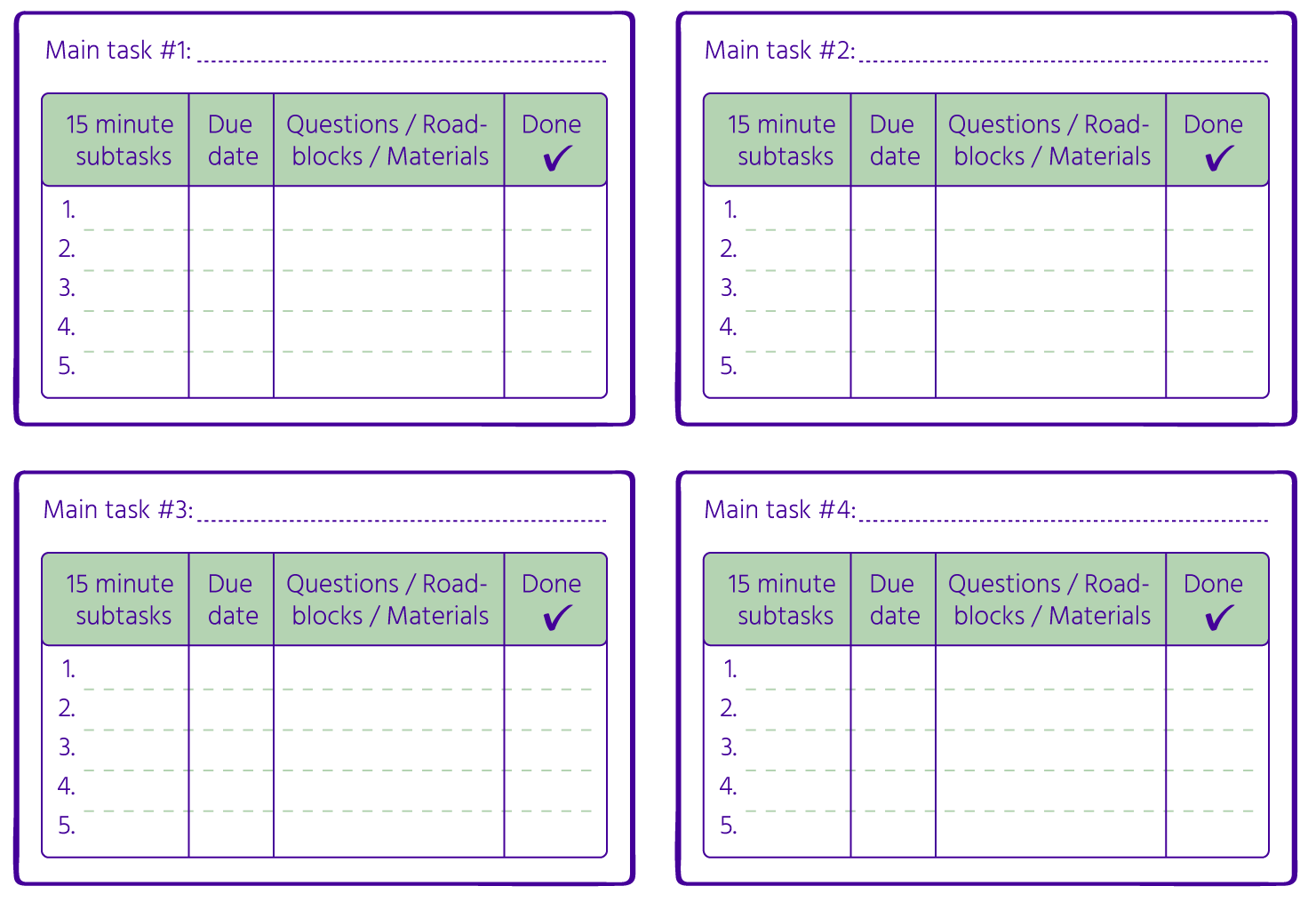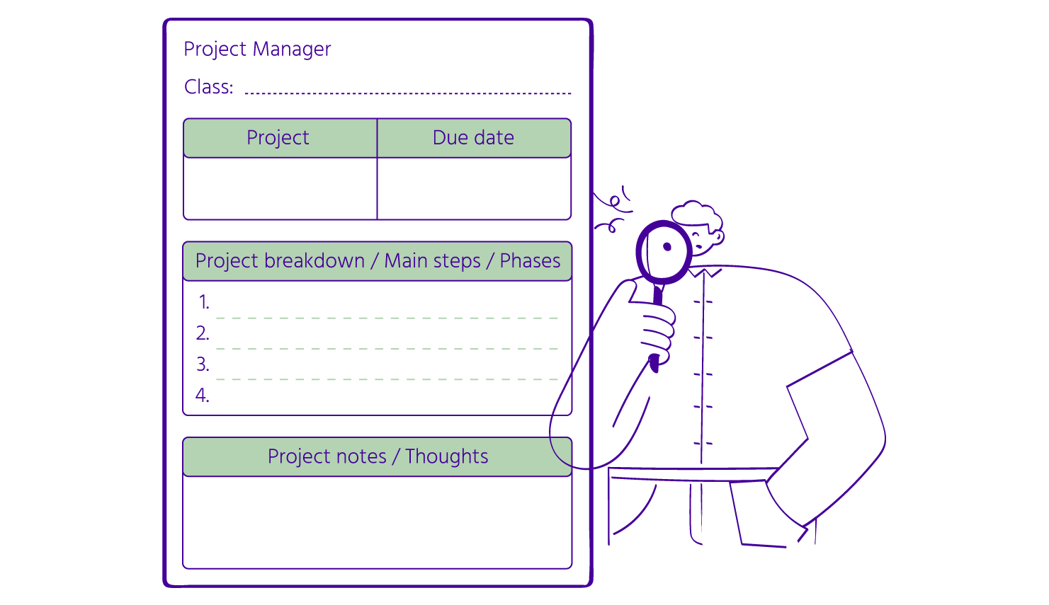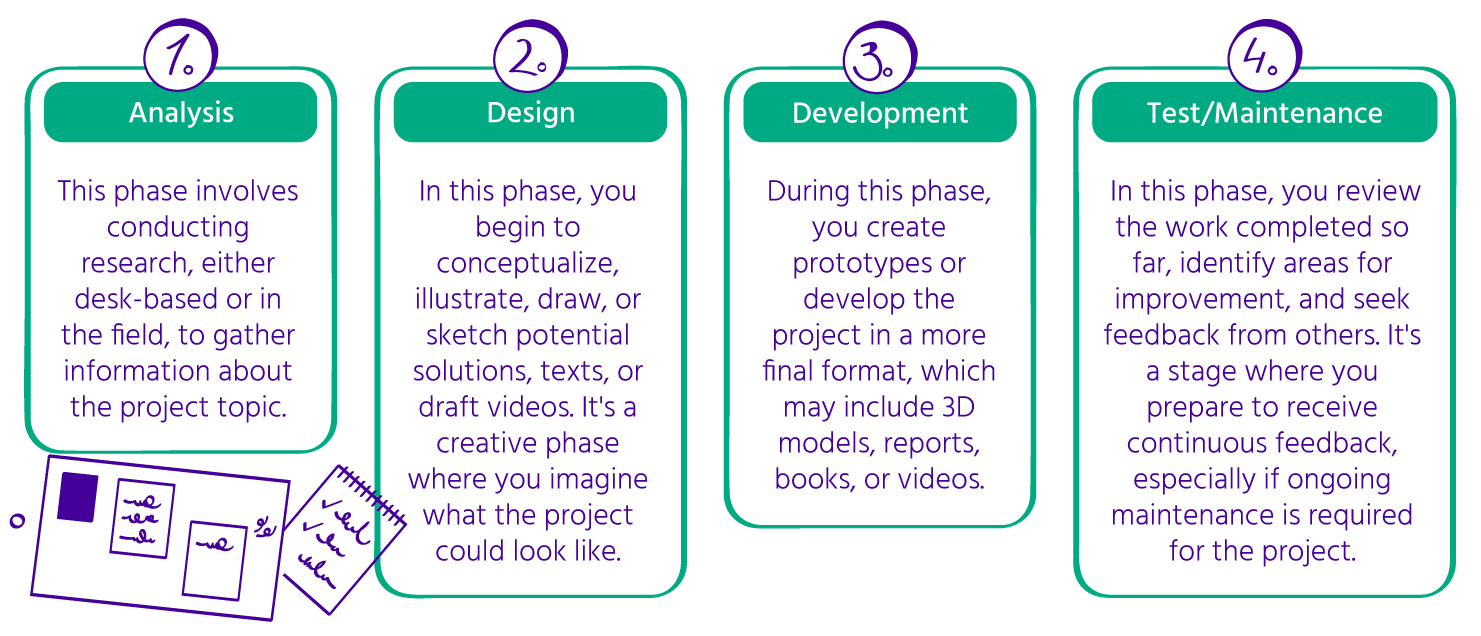Los proyectos pueden variar en tamaño, pero todos ellos consisten en tareas específicas que necesitan ser ejecutadas. La clave para una planificación efectiva del proyecto es desglosar la idea general en piezas más pequeñas y manejables conocidas como paquetes de trabajo o tareas. Puedes ayudar a tus estudiantes a identificar y listar tareas de alto nivel. Inicialmente, algunas de estas tareas pueden ser aún demasiado grandes para manejar, por lo que gradualmente, necesitarás ayudar a tus estudiantes a reflexionar y dividirlas aún más en tareas más pequeñas y alcanzables. Ten en cuenta que algunos estudiantes pueden sobresalir en esto a una temprana edad, mientras que otros pueden requerir más apoyo. Todo depende de sus necesidades individuales.